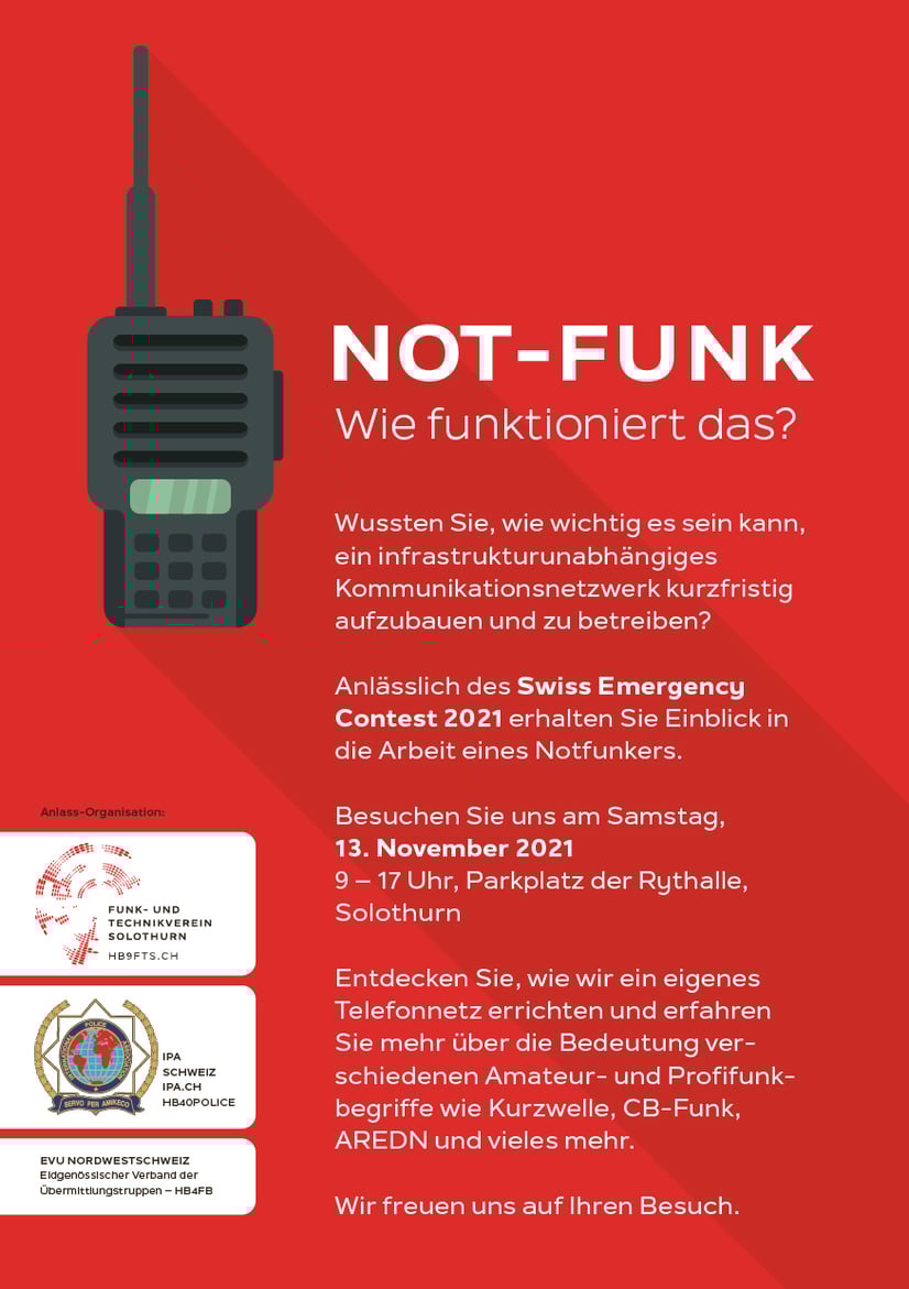 Am 13. November 2021 findet die Notfunkübung statt. Wir haben einen zentralen Standort in Solothurn, hinter der Rythalle auf dem grossen Parkplatz. Besucher sind herzlich willkommen.